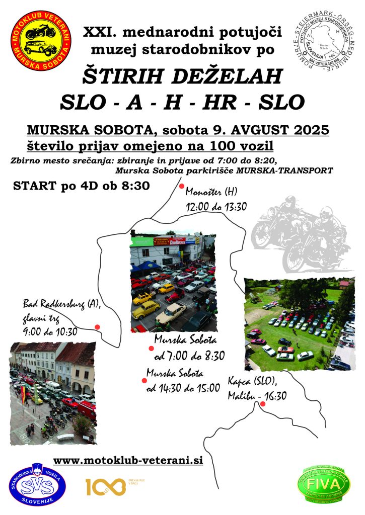 Vožnja potujočega muzeja po 4 deželah bo v soboto 9. avgusta 2025, z zbiranjem udeležencev na parkirišču podjetja MURSKA-TRANSPORT v Murski Soboti, Obrtna ulica 28 – sedež Motokluba Veterani (poleg nakupovalnega centra INTERSPAR – BTC).
